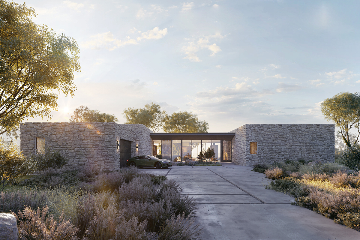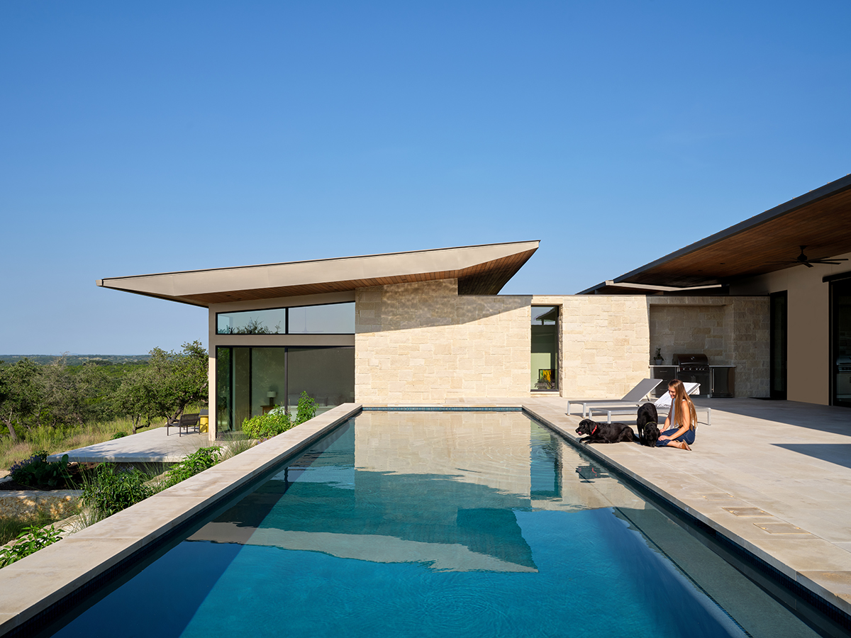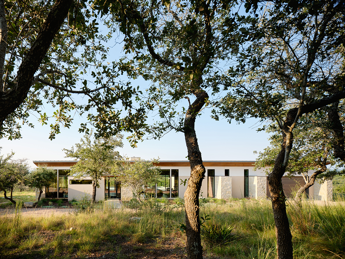 Also in Texas Hill Country is the Mount Sharp Residence, a retirement dream home on a 22-acre property. The firm sited the low-slung dwelling along one of the site’s small plateaus, which run east-west, to maximize sunlight, natural ventilation, and views. Various functional elements, such as kitchen appliances and storage areas, are tidily organized along extra-thick walls that run perpendicular to the plateau. These rugged walls, clad in coarse-cut stone, are part of the home’s passive ventilation system: The breezes coming over the top of the plateau can flow through the openings and cool the spaces between the walls. The firm’s description of this house reads: “The materiality of the project is concentrated, regional, and meant to provide comfort and shelter when the elements are extreme, yet its solidity dissolves when the house is opened up.”