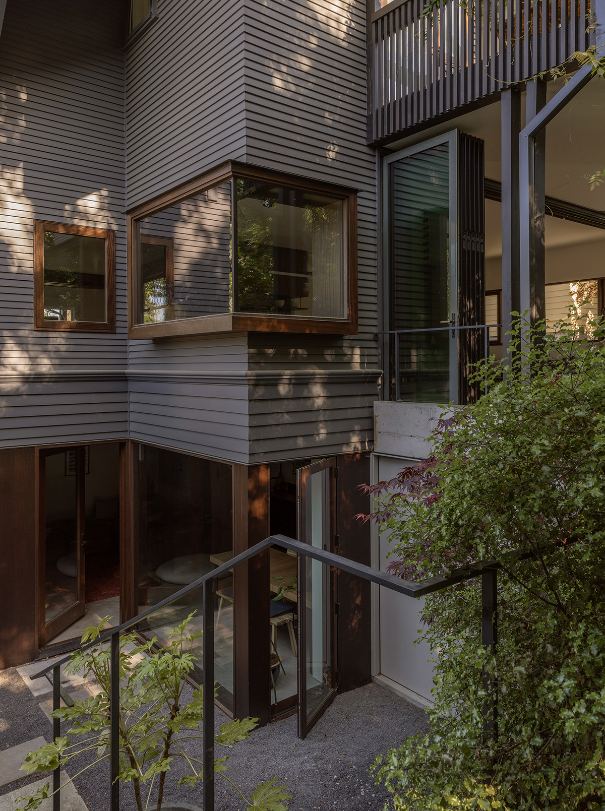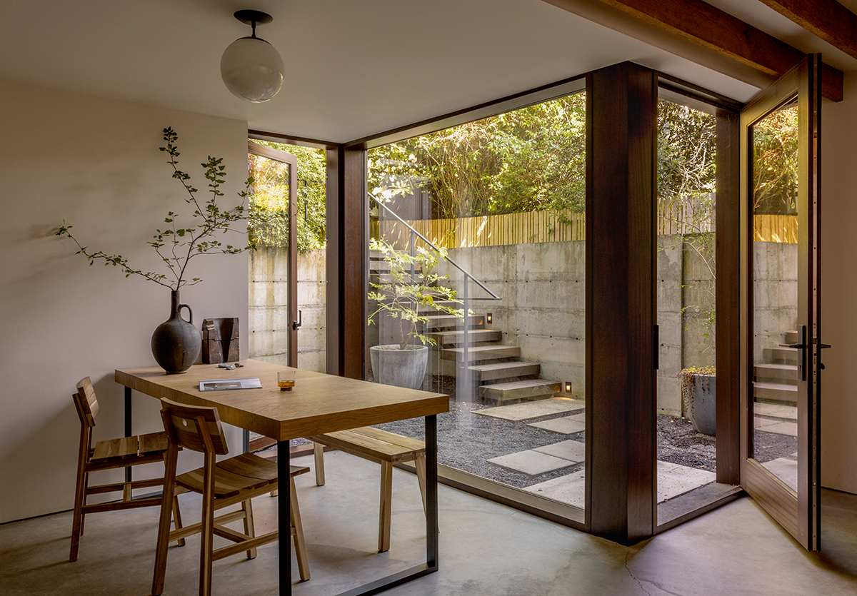 “The owners were very attached to the materiality of the house and wanted to honor and reuse whatever they could,” Matt says. “Our contractor documented and preserved a lot of things as they were deconstructed, and framing was reused whenever possible.” A cast-in-place concrete retaining wall holds space for the sunken patio and entryway. “It’s a low-tech version of rammed concrete,” Matt says. “We made 2-foot lifts, put in stone, let it dry, and put in the next lift, which created horizontal lines. It was an efficient way of creating texture.” The ADU entry stairs are made from the same wood as the decks: Dinizia excelsa hardwood repurposed from a 40-year-old highway sound barrier in Chicago. Tying the work together, the exterior was painted in Benjamin Moore Kendall Charcoal, and windows in the renovation areas were rebuilt with energy-efficient glazing.