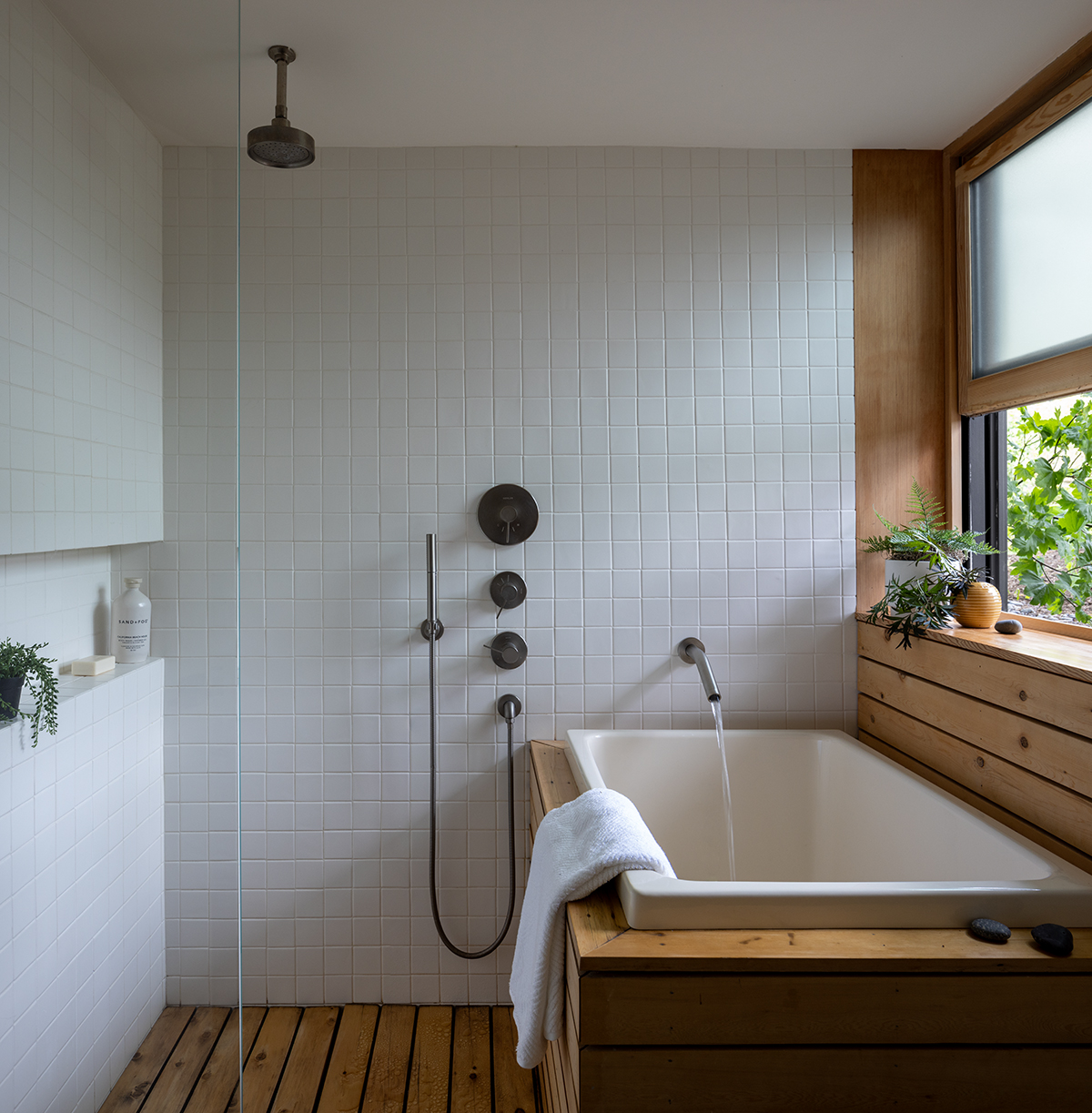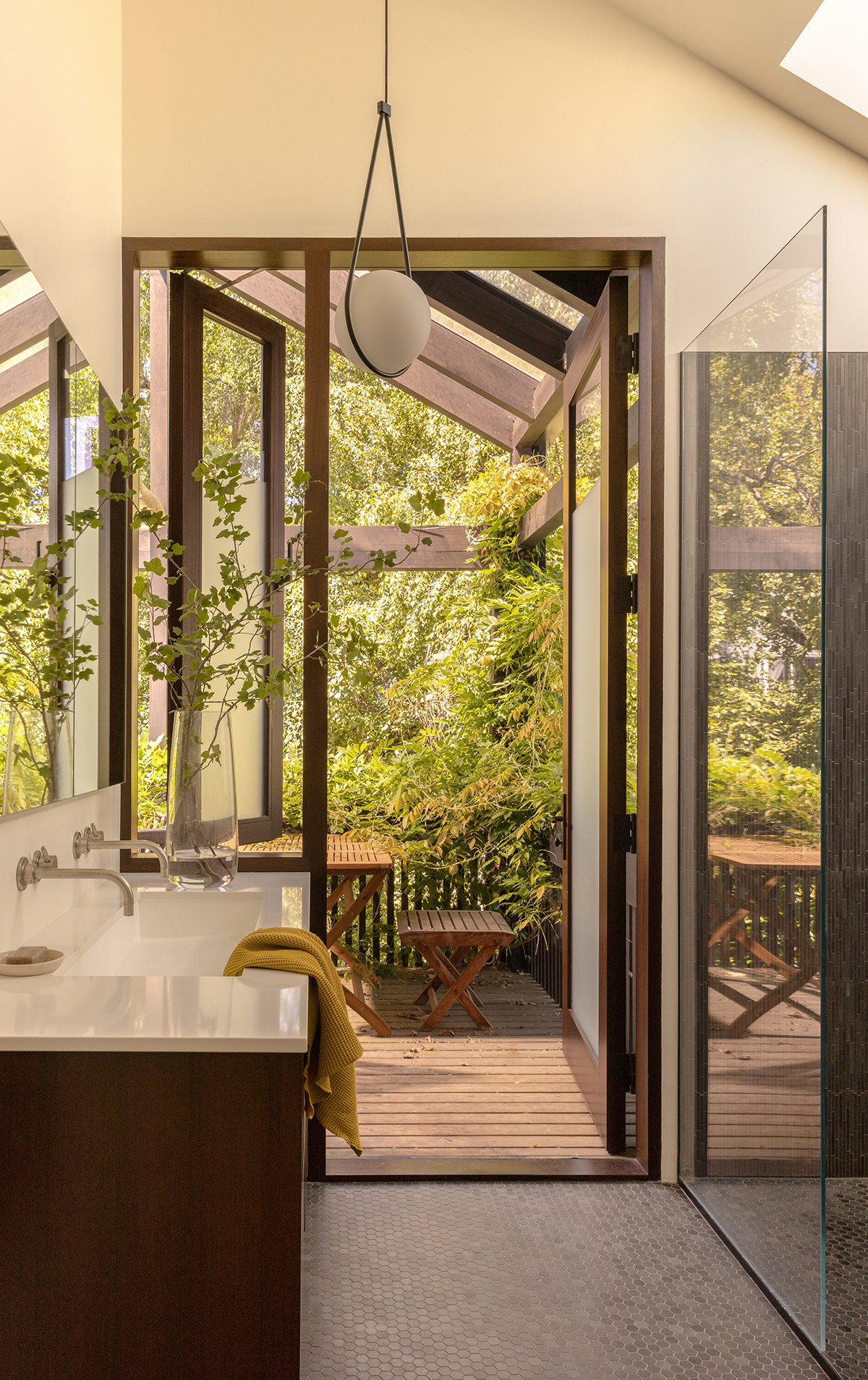 While the second story also has a distinct interior presence, it is now tuned to the outside world. Matt made sure of that by reallocating former storage space to a primary bath that opens to an inviting deck and sauna above the backyard. “One of the prompts of the design brief was to retain the exterior building envelope and work within that,” Matt says. “It was a fun exercise in how to make it compact and feel luxurious.” In the floor-plan shuffle, another former storage room between the primary bedroom and front yoga room now serves as the primary closet. A second bedroom and bath are across the hall, which also opens to the deck.