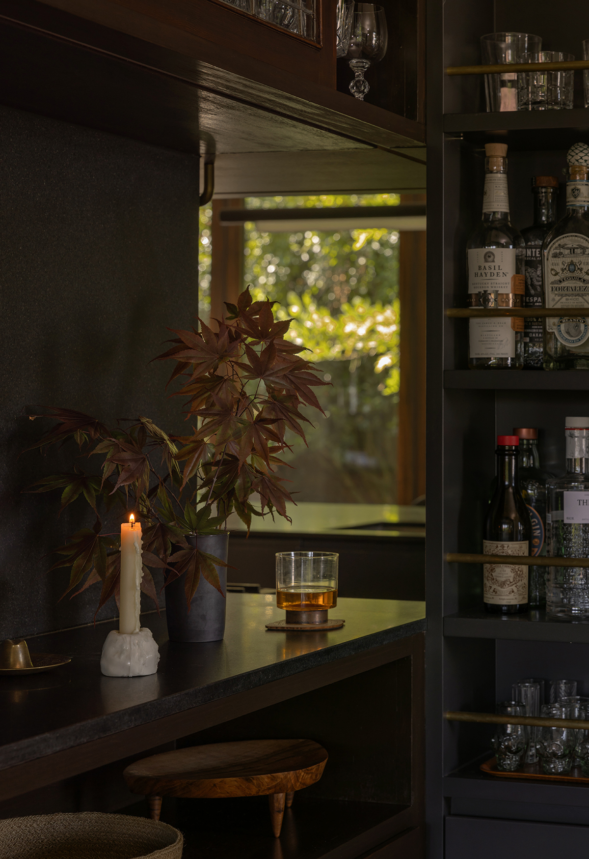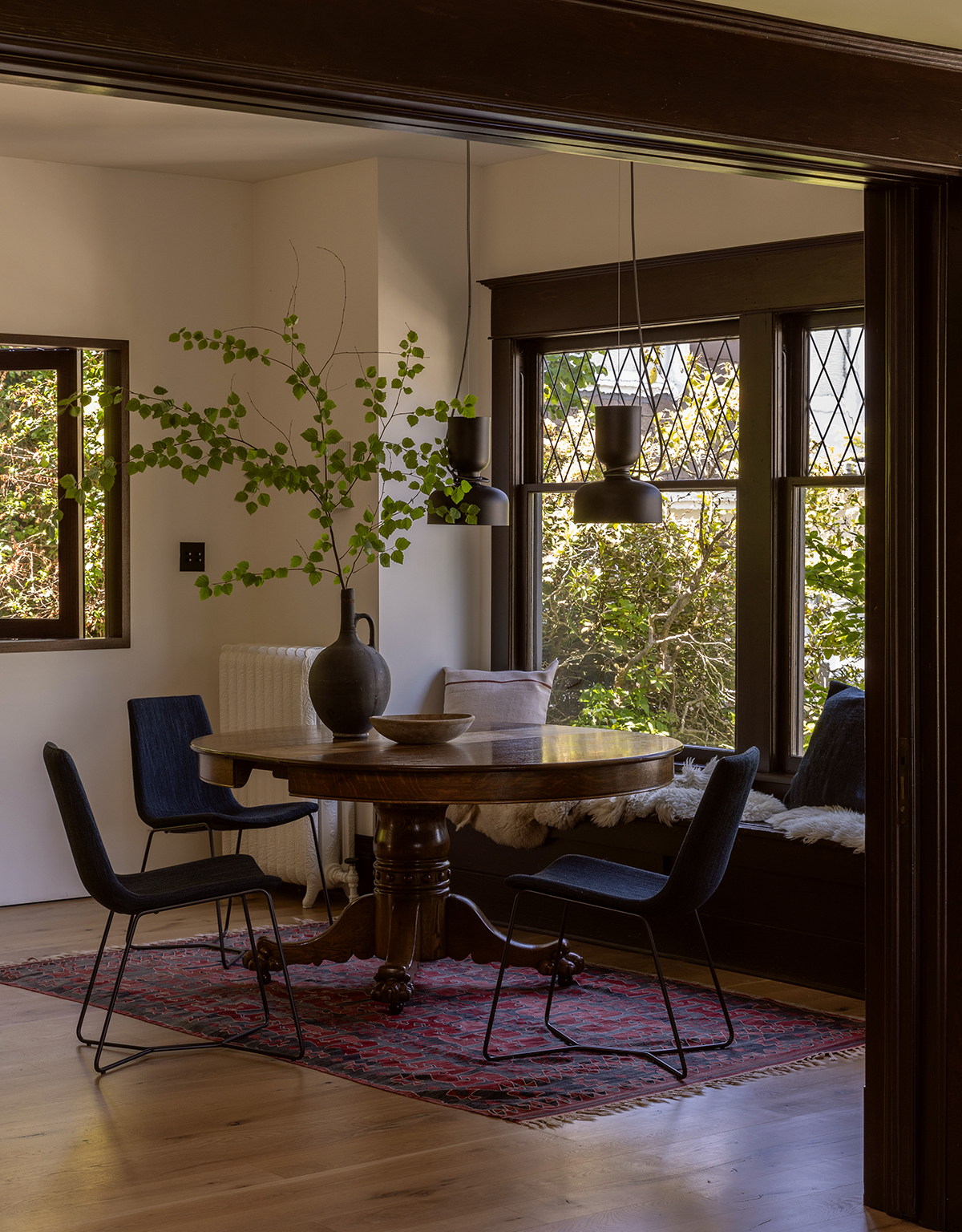 Major transformations were saved for the gutted back of the house. To improve the flow, storage cabinets and a wall subdividing the kitchen and seating area were removed to create a larger kitchen that opens to a lounge and a dining area with built-in window seating. The kitchen—a combination of dark painted cabinetry and quarter-sawn walnut upper cabinets with an ebony stain—ties into the home’s existing deep, rich palette, while a new terrazzo floor and brass accents bring the sparkle.