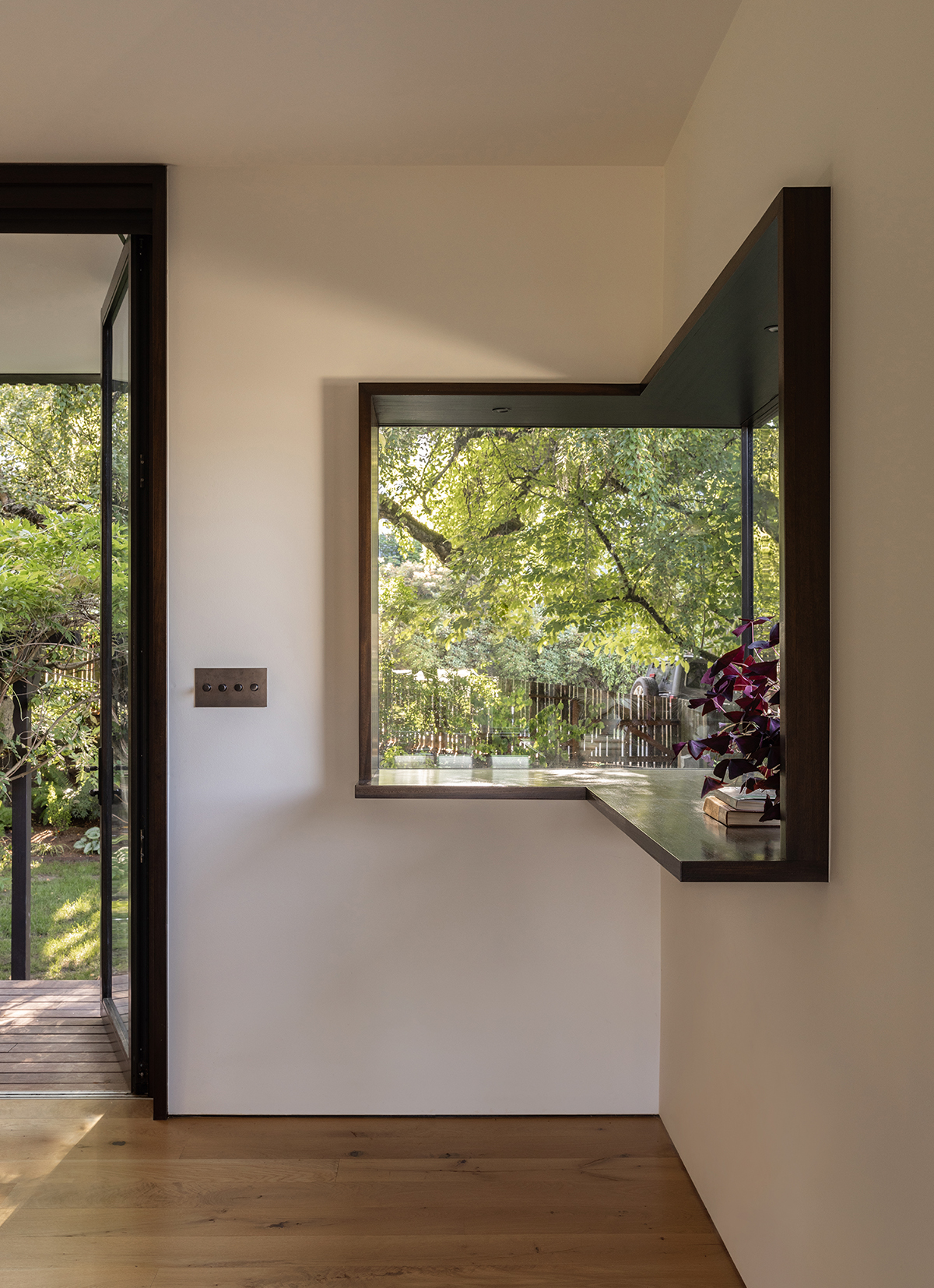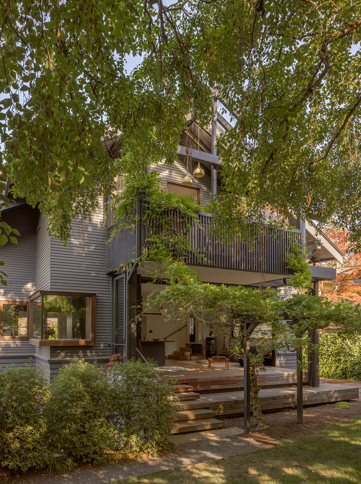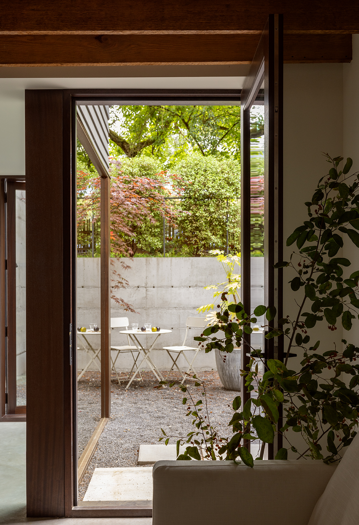 As an antidote to the Craftman’s inward gaze, Matt designed modern bay windows and opened the entire back wall to the rear yard. There, a 20-foot-long fold-and-pivot glazed door system, installed within a steel moment frame, lets the occupants spill out to a new porch and down to the private garden and back lane.