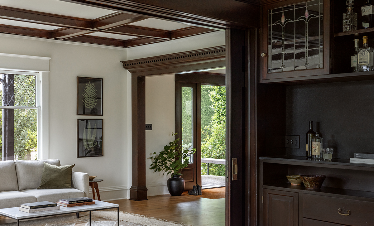 Inside, the remodel builds on the virtually untouched living room at the front of the house, with its dark-stained oak trim and floors. A bar area off the living room starts the transition from old to new. There, Matt and his team partially dismantled and reassembled a storage cabinet, leaving the section closest to the living room intact, reconstructing the middle part using the old pieces, and adding new elements next to the kitchen. “It was a classic Craftsman built-in, but the new part is configured to hold the owners’ music equipment, art, and storage needs,” he says.