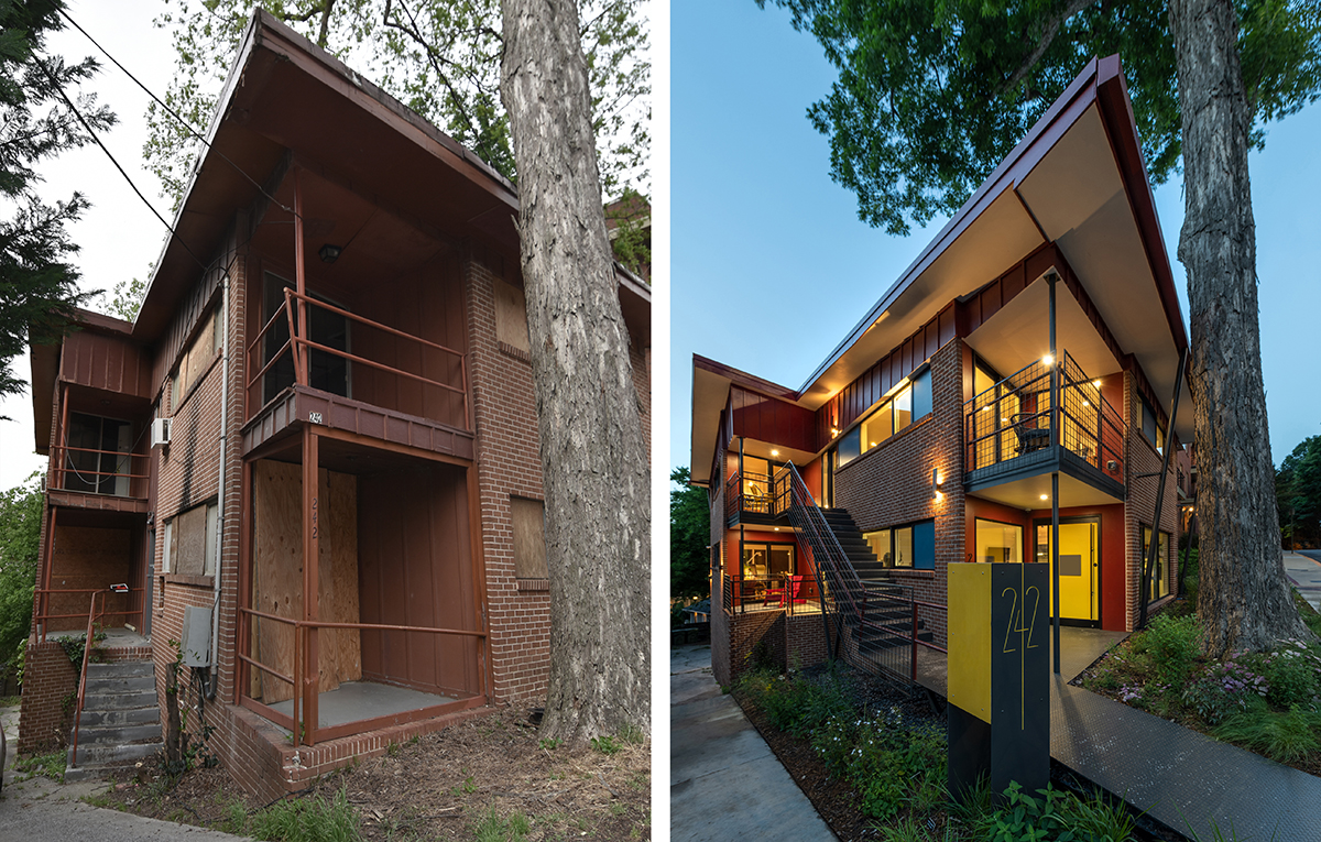 Robert M. Cain’s firm has a history of saving endangered buildings. And this is one of its most successful rescues so far. The small midcentury apartment building was on the brink of demolition when project architect Carmen Stan, AIA, ran across it while walking her dog.