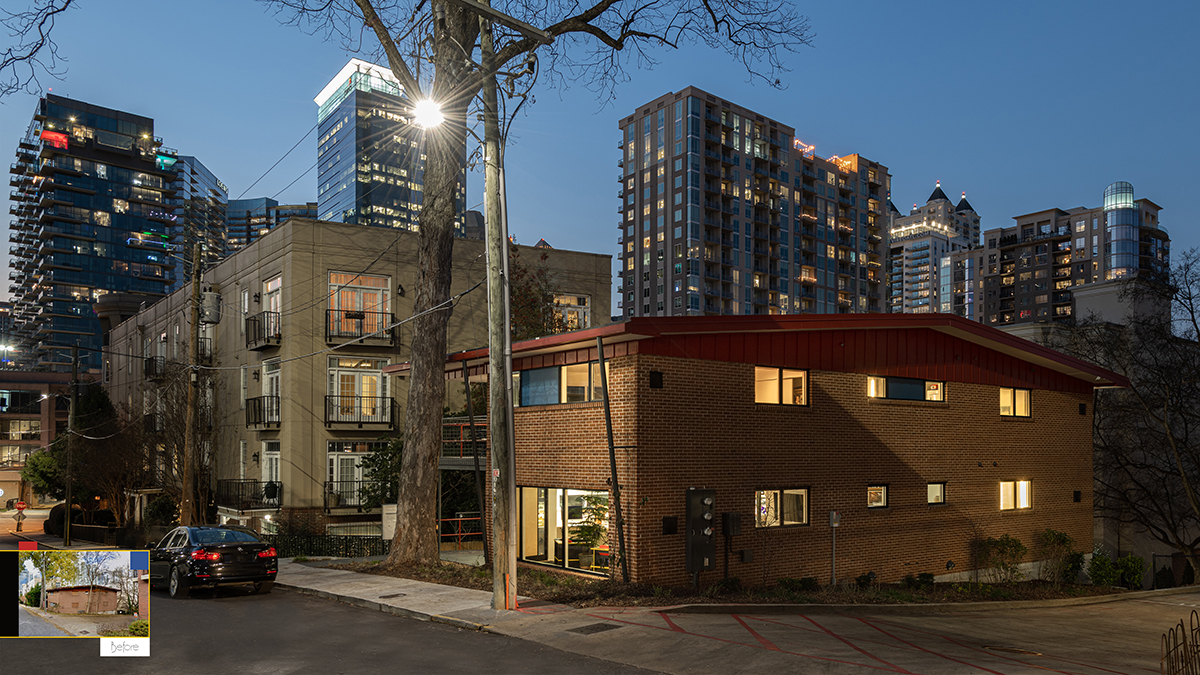 “It had been on the market for years, and under contract by a number of developers who could not satisfy the parking requirement,” says Bob. He was intrigued by the possibilities of the building, which dead ends in Piedmont Park, Atlanta’s stellar Olmstead-designed urban oasis, but the clock was ticking.