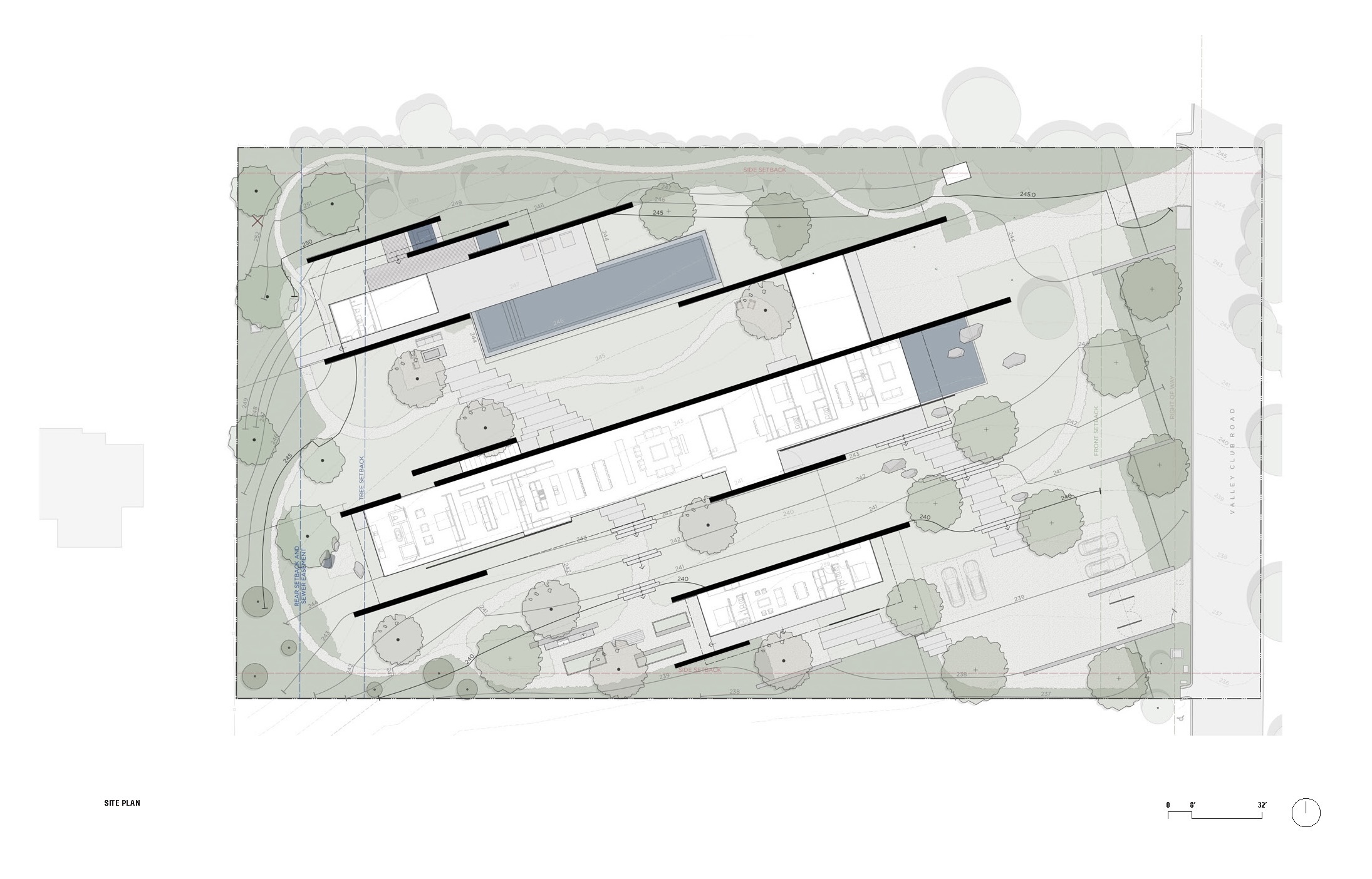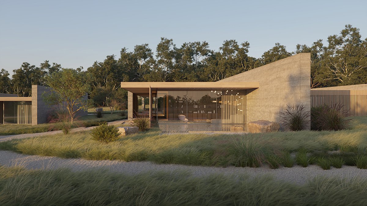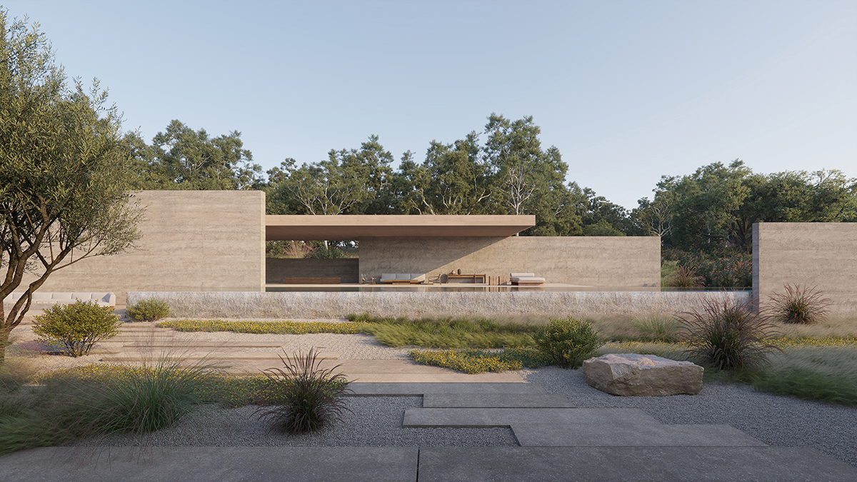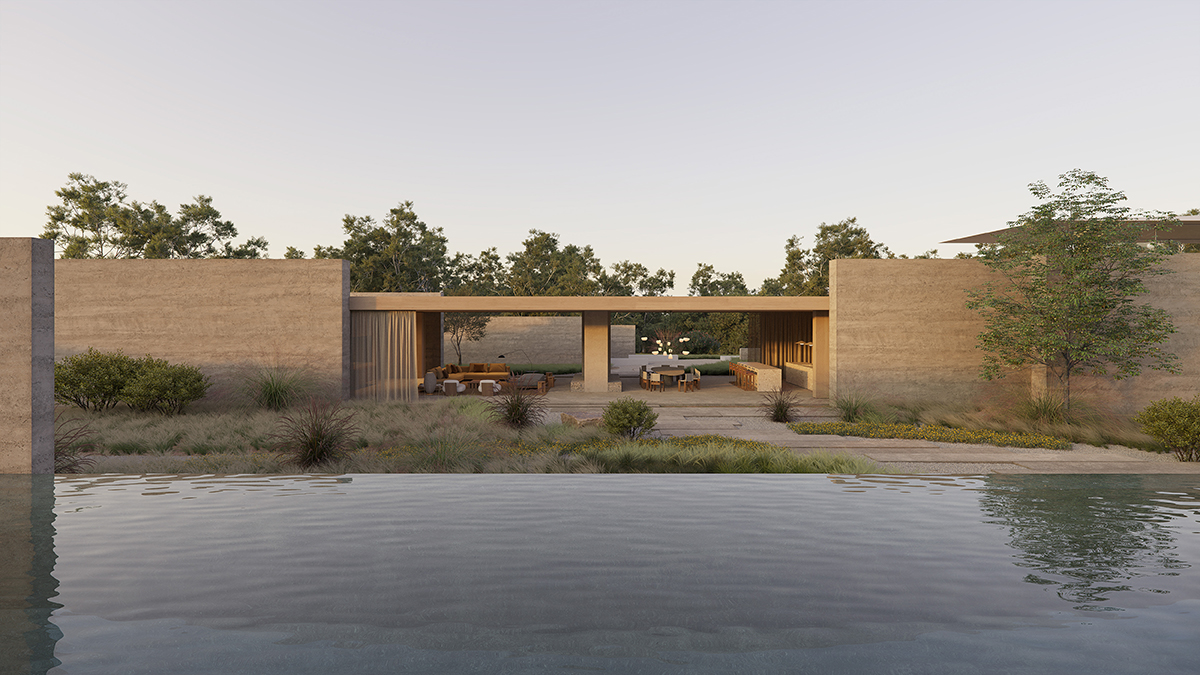Valley House’s linearity and vertical layering was inspired by several Richard Serra sculptures owned by the clients, who are big art collectors. “We wanted the walls to be rooted in the landscape and even be conveyed as somewhat of a ruin, as if it’s been there a long time,” says Tony Schonhardt, AIA, director of design. Staggered diagonally across the 2-acre plot, they align with the natural topography that gently slopes from northwest to southeast, allowing the landscape to meander through and around the structures. The self-finishing rammed earth walls define four volumes—main house, guest house, garage, and pool cabana—and eliminate the need for a second decorative layer. “The height of the walls is dictated by what is structurally required to support those very simple roof elements,” he says.