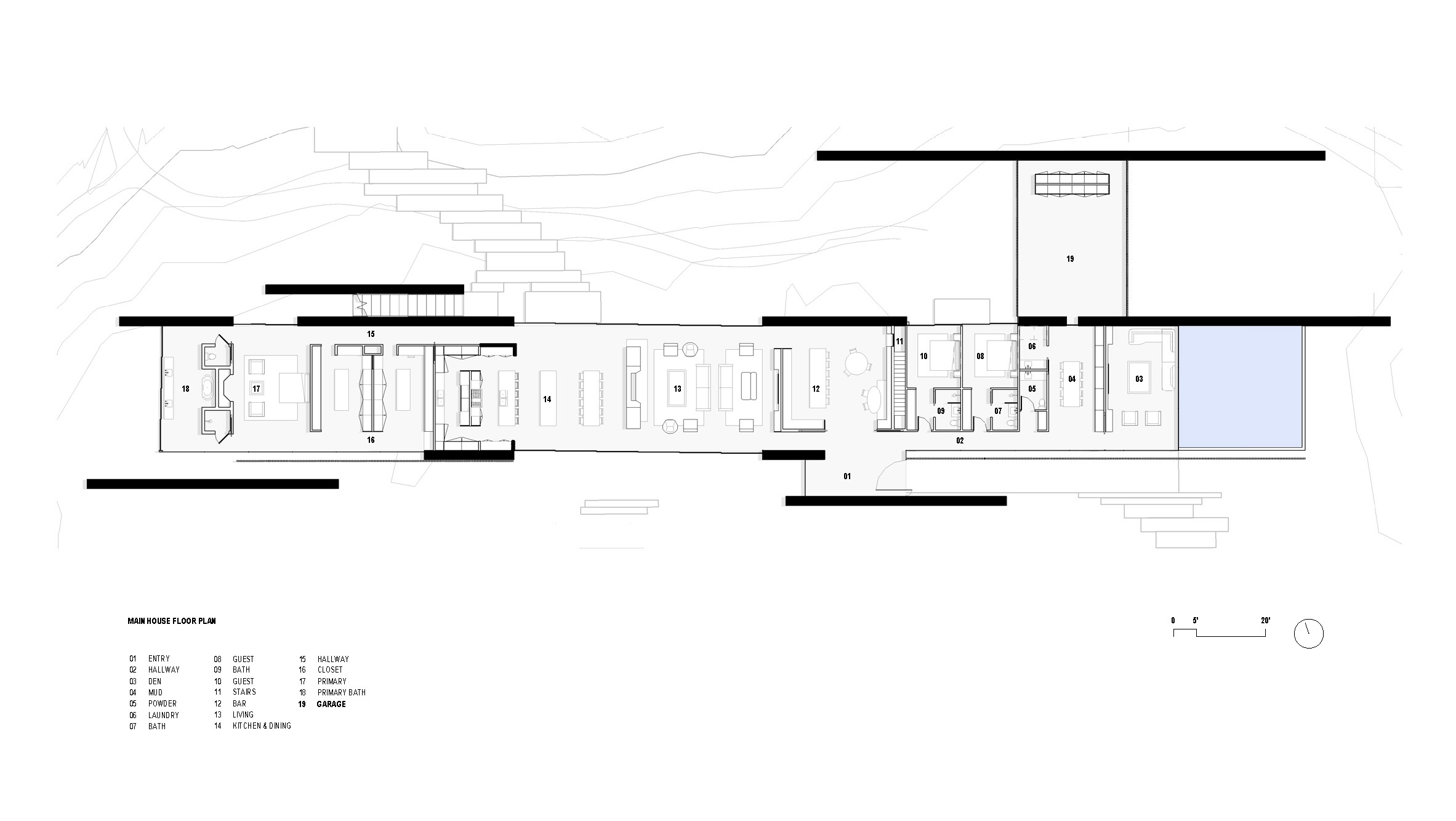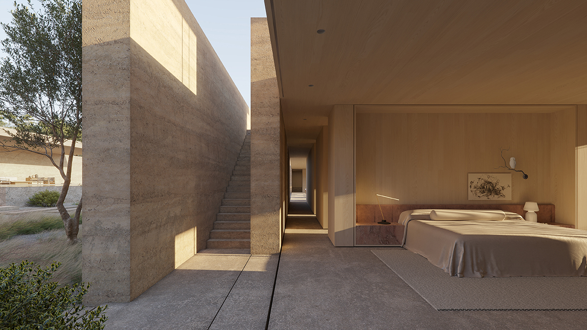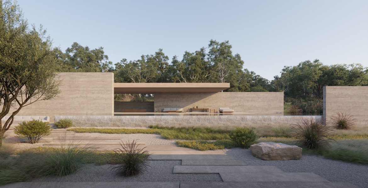 Valley House’s linearity and vertical layering was inspired by several Richard Serra sculptures owned by the clients, who are big art collectors. “We wanted the walls to be rooted in the landscape and even be conveyed as somewhat of a ruin, as if it’s been there a long time,” says Tony Schonhardt, AIA, director of design. Staggered diagonally across the 2-acre plot, they align with the natural topography that gently slopes from northwest to southeast, allowing the landscape to meander through and around the structures. The self-finishing rammed earth walls define four volumes—main house, guest house, garage, and pool cabana—and eliminate the need for a second decorative layer. “The height of the walls is dictated by what is structurally required to support those very simple roof elements,” he says.
