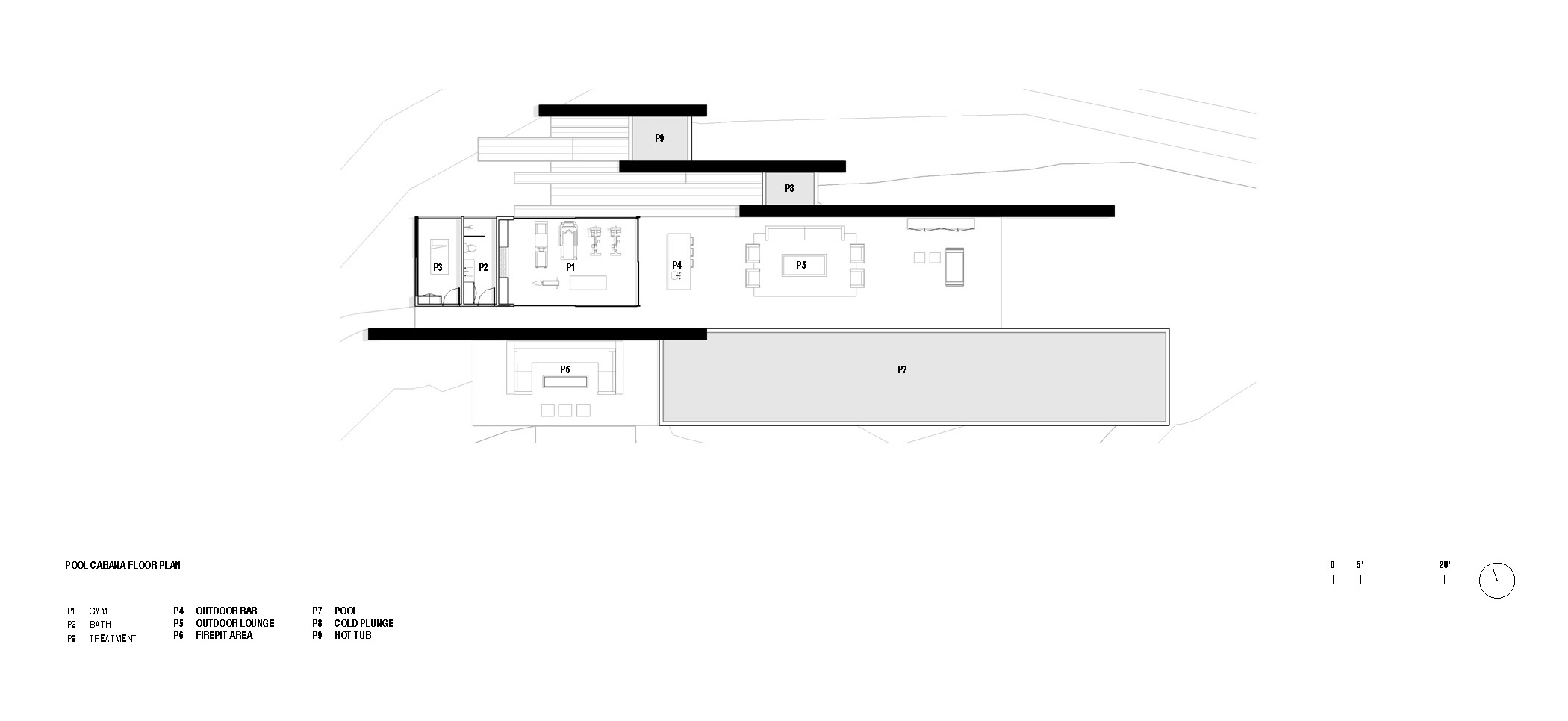A spare palette prevails: Interior partitions are wood with metal accents. Stone flooring continues out to the landscape, and the wood roof planes cover both interior and exterior spaces, strengthening connections between inside and out. “Every space offers the opportunity to engage with the natural world visually and physically through greenery or water moving around,” Tony says. “It creates a language whereby we are inviting the user to sit outside as much as inside.”