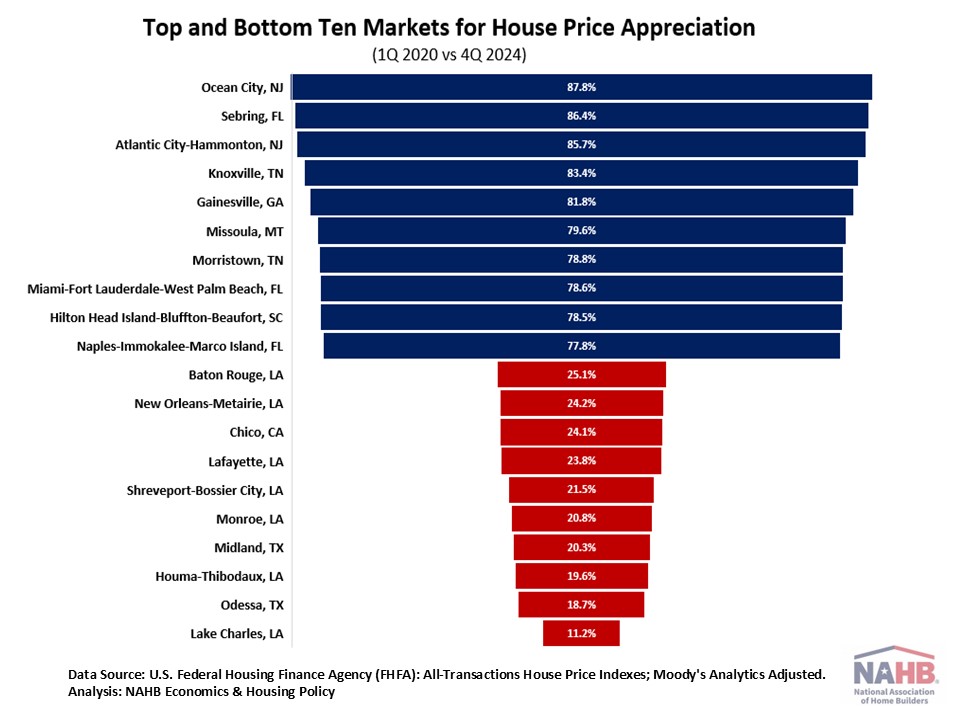 The table below shows the top and bottom ten markets for house price appreciation between the first quarter of 2020 and the fourth quarter of 2024. Among all the metro areas, house price appreciation ranged from 11.2% to 87.8%. Ocean City, NJ experienced the highest house price appreciation. Lake Charles, LA had the lowest appreciation for the third quarter in a row.