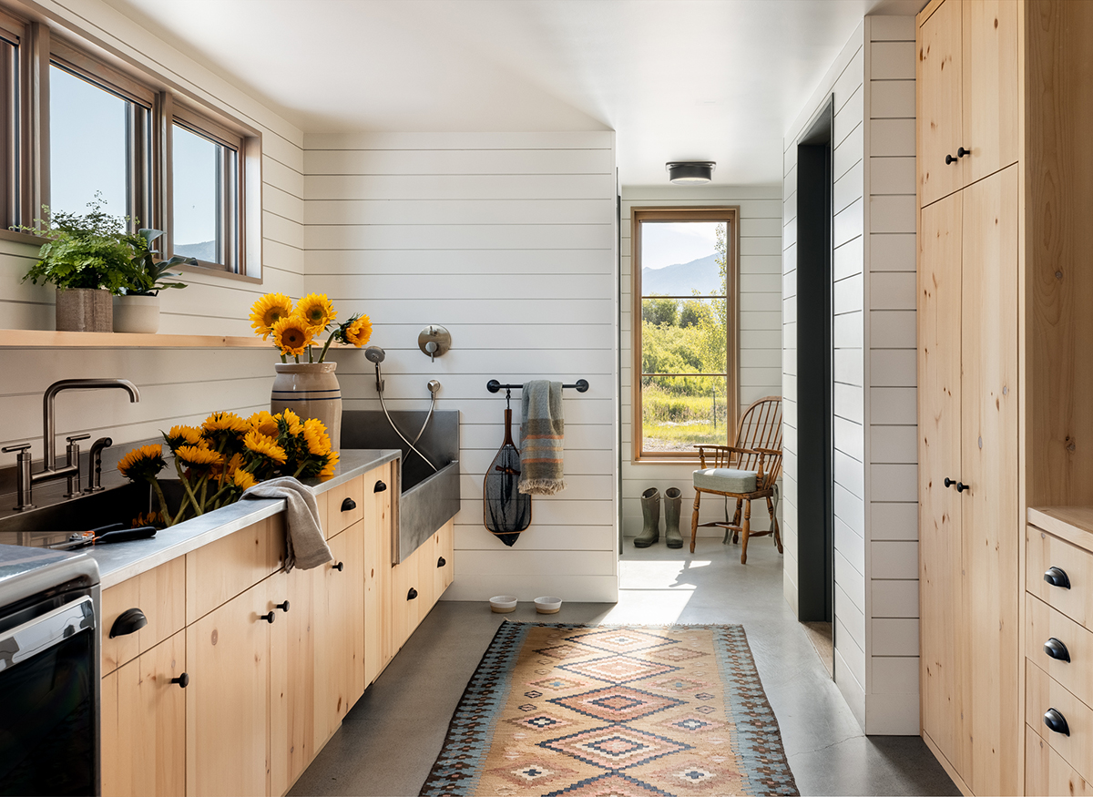 In addition to the “straightforward” program of three bedrooms, an office, and a great room, the clients asked for two spaces dedicated to their special passions. The first is a commodious mudroom/gear room. “They’re fishermen and duck hunters, so they have every kind of rain gear, boot gear, waders—anything and everything,” says Tim. Appointed with plentiful built-in storage, easy-to-clean stainless-steel counters, and a dog washing station for the crusty canines, the room underscores the rough-and-ready romance of their frontier life.