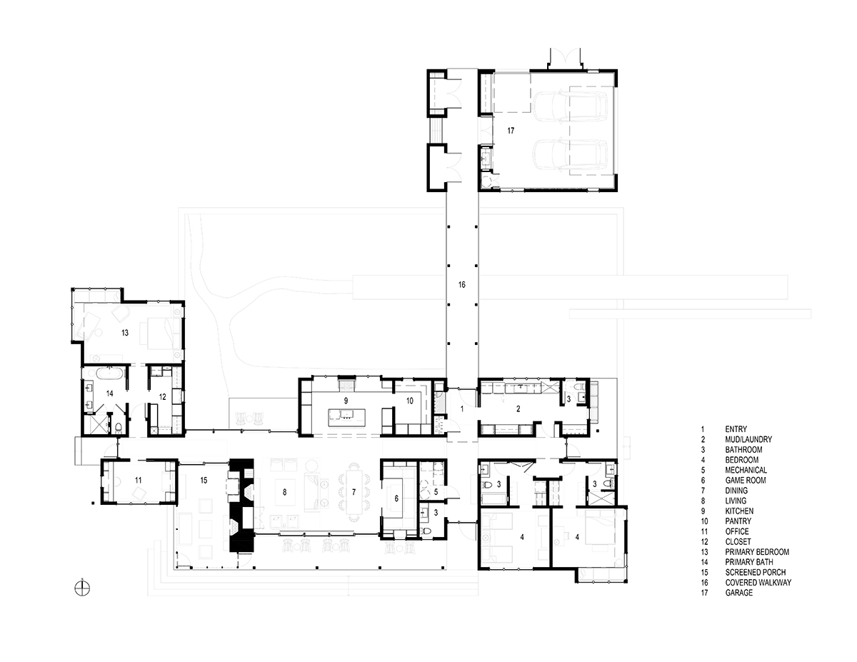 “We thought of the house as a tool to get the owners outdoors and allow them to explore the site,” says Steve. To that end, the one-story building takes every opportunity to point the occupants toward a means of egress. “We nerded out a bit by laying out the house exactly north/south and east/west, with two hallways that intersect right in the entry hall.