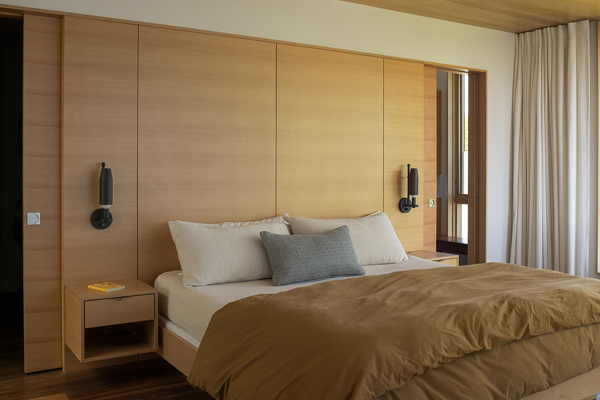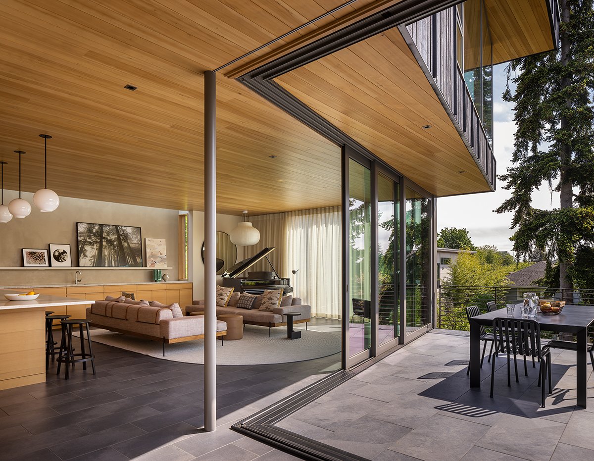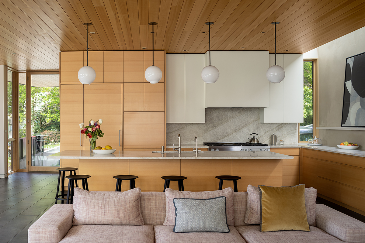 As they did with light and patterns, PBW Architects strove for material continuity between the outdoors and indoors. After a period of research, the designers found hemlock ceiling planks that had a warm and modern feel, matte finish, and crucially, an exterior rating that enables their use outdoors at soffits. For the kitchen and living area millwork, they specified beechwood with a similarly warm tone and tight grain; for window frames, they selected alderwood.