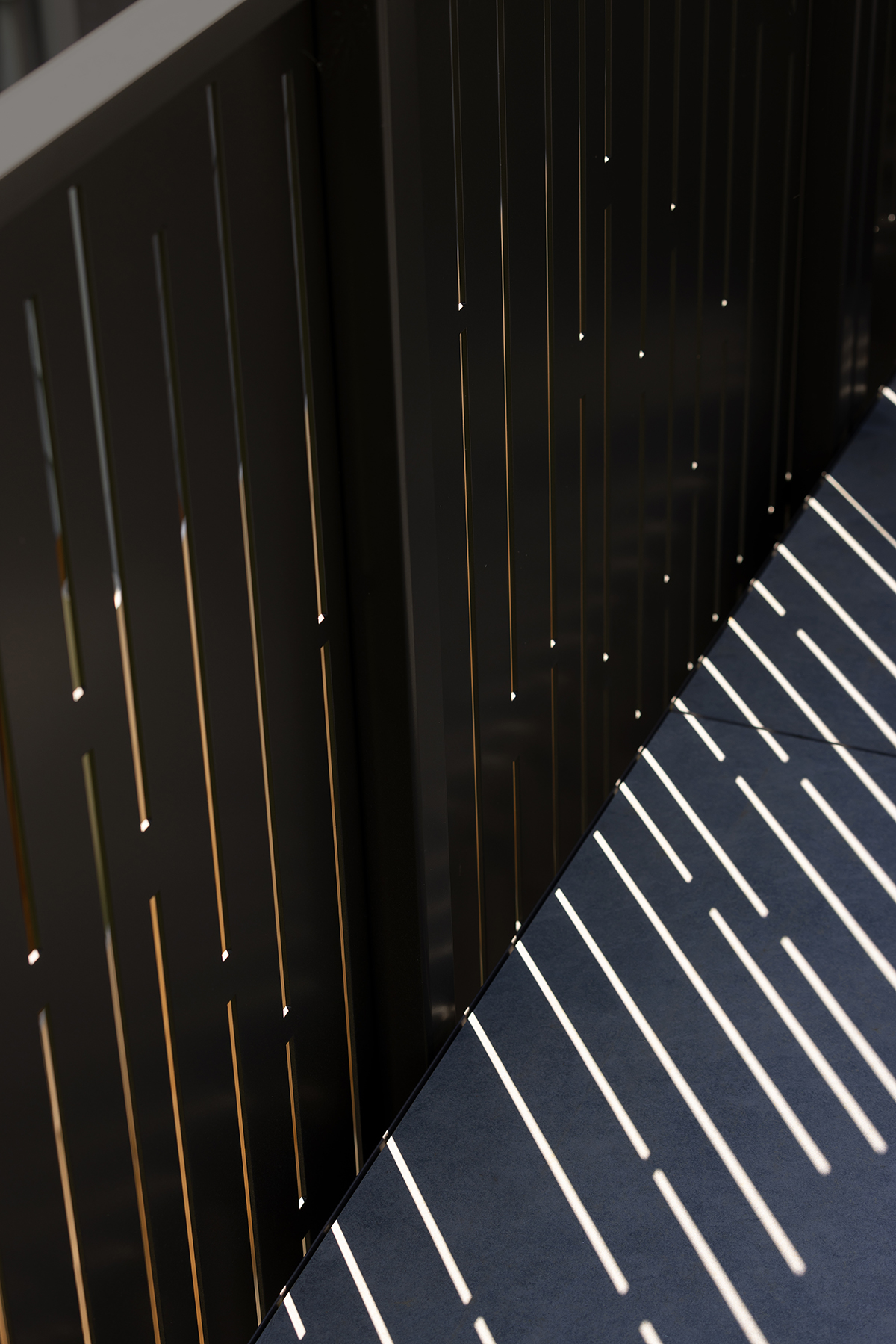 Custom steel paneling bounding the deck’s south edge provides both privacy and functionality. The panels act as an 85-inch-tall screen for more intimate gathering areas inside and outside of the main living area before it drops to handrail height alongside more public areas, guiding residents down to a lower-level patio and play space. Light and breezes permeate the panels through waterjet-cut vertical slots that widen in dimension for the more exposed recreational areas.