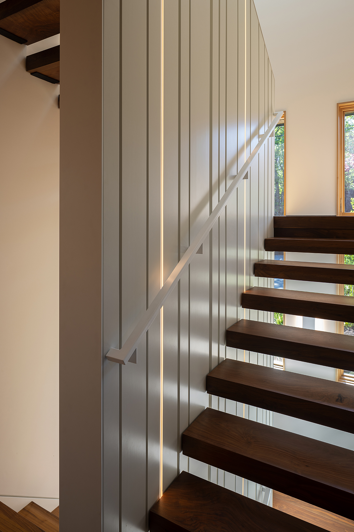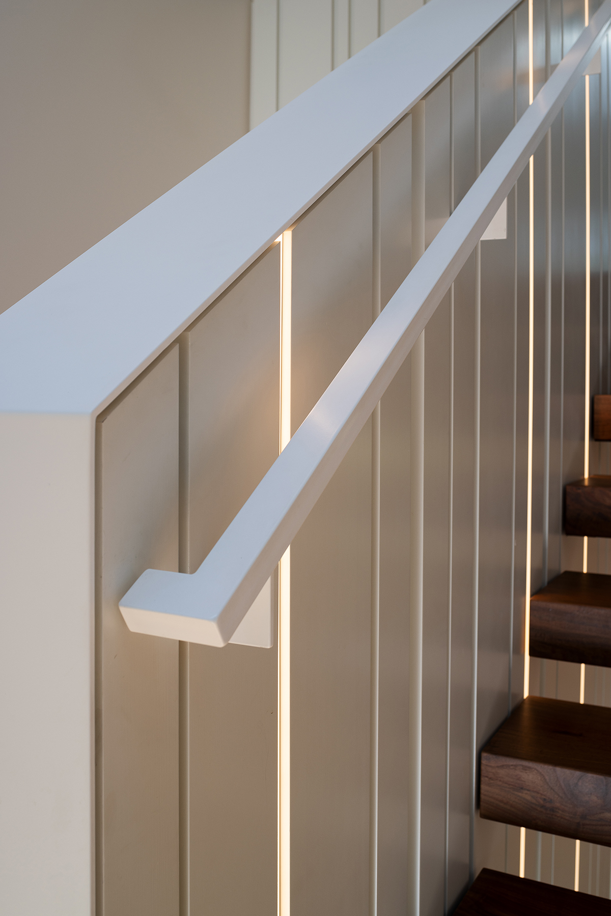 The central stair wall continues the theme of striations, comprising vertical wood trim of varying widths and loosely spaced to recall the deck paneling as well as the striated exterior siding. Electric light glows softly through a few strategic gaps, creating a dappled effect that harkens to sunlight streaming through the deck panels.