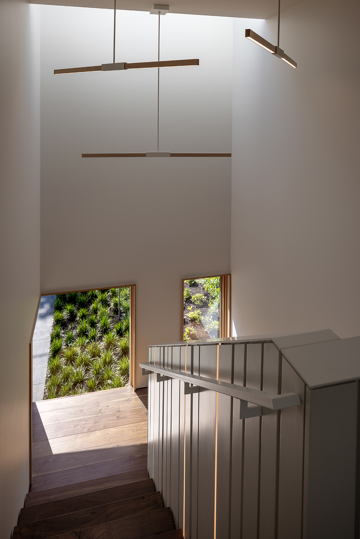 Two additional skylights illuminate the otherwise enclosed stairwell and upstairs hallway. “In the morning, as you walk around in your pajamas, you still have that privacy until you choose to walk down the stairs and join the public space,” Shawn says.
