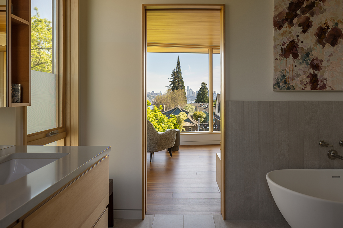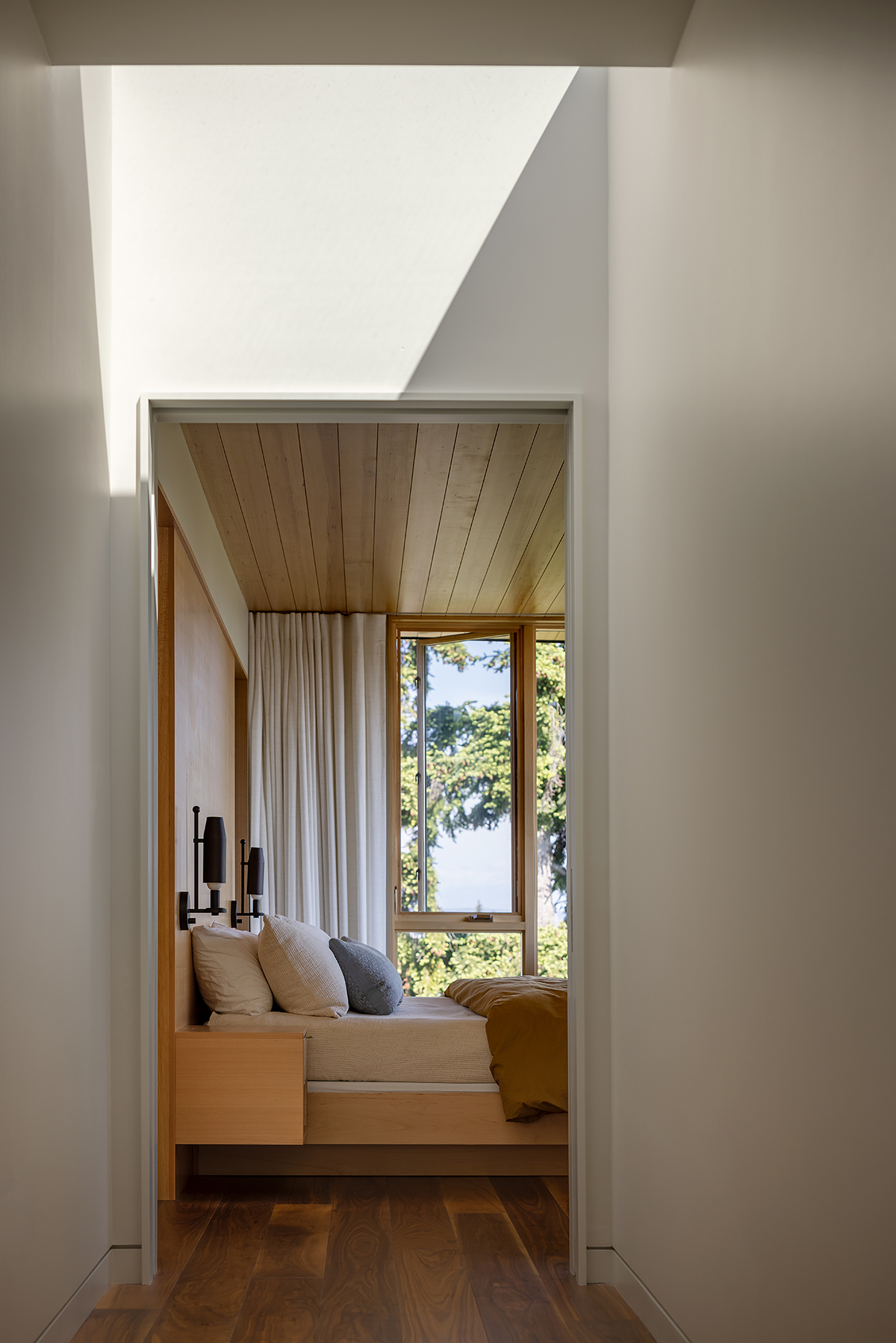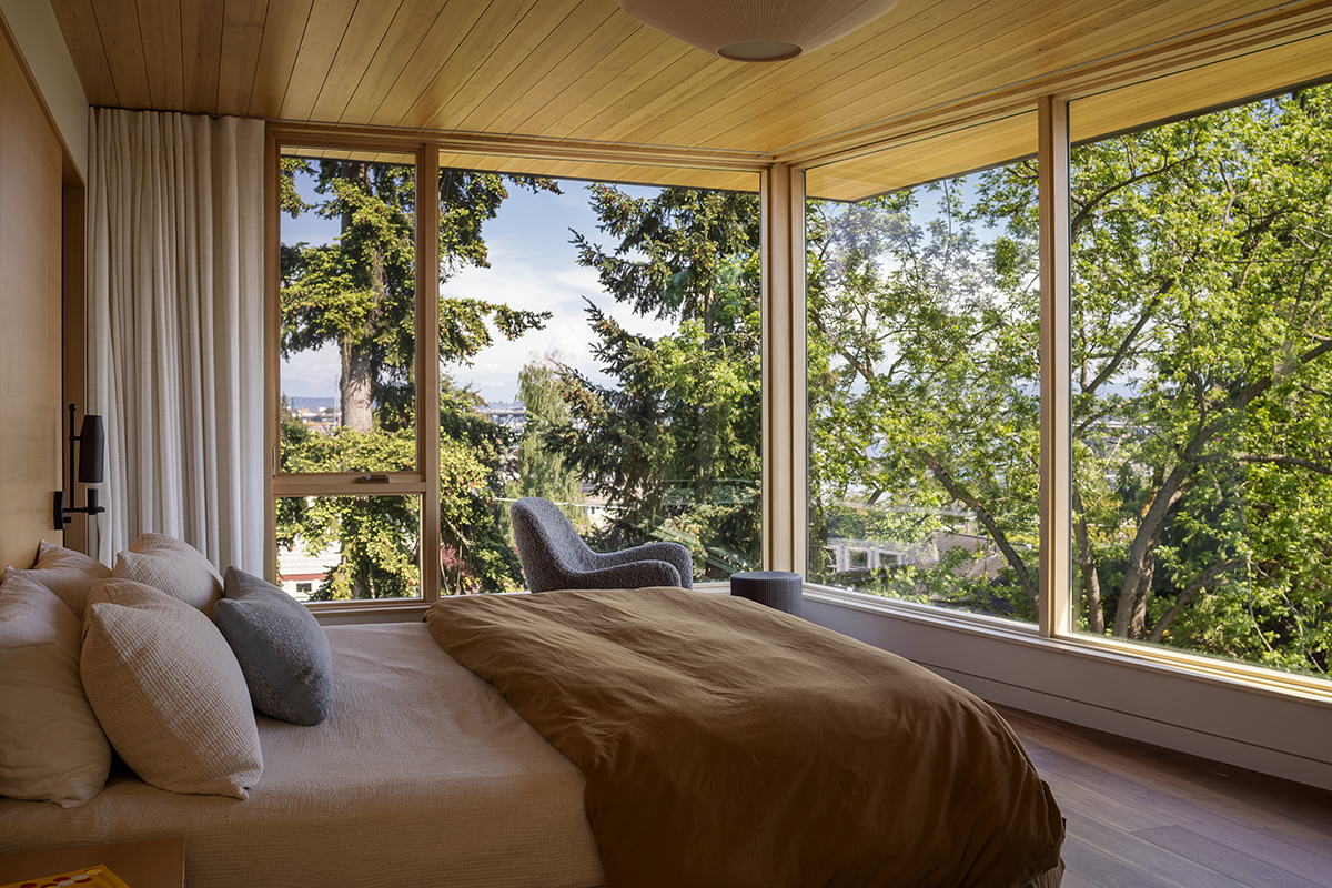 Both that light and the views into and out of the house are controlled through its architecture. Thoughtful extensions of floor plates create overhangs that offer protection from the elements at the entrance and part of the deck, while a seemingly rectangular roof plan that subtly splays and pivots into a five-sided polygon provides coverage from sun and rain at the primary bedroom’s corner window. “When you’re nested inside the house, there are these layers of covered areas over you,” Dan says. “It’s subtle, but significantly effective.”