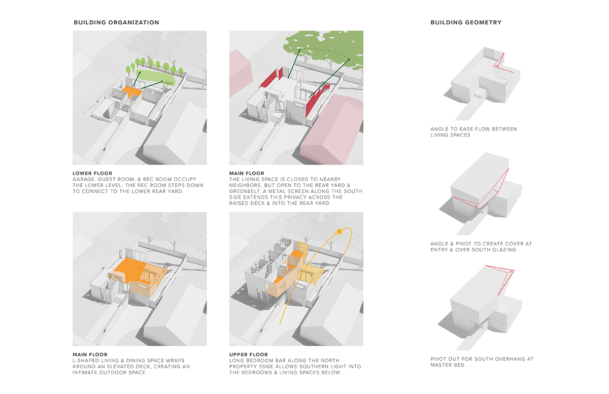 The strong indoor–outdoor connection continues east to the open L-shaped living space, which segues into a spacious south-facing, elevated deck via perpendicular lift and slide doors that open from the inside corner of the L. PBW Architects owner and principal Dan Wickline says the project siting intentionally pushes the house volume to the north and pulls it back from the south to open the structure to the neighborhood and to abundant natural light.