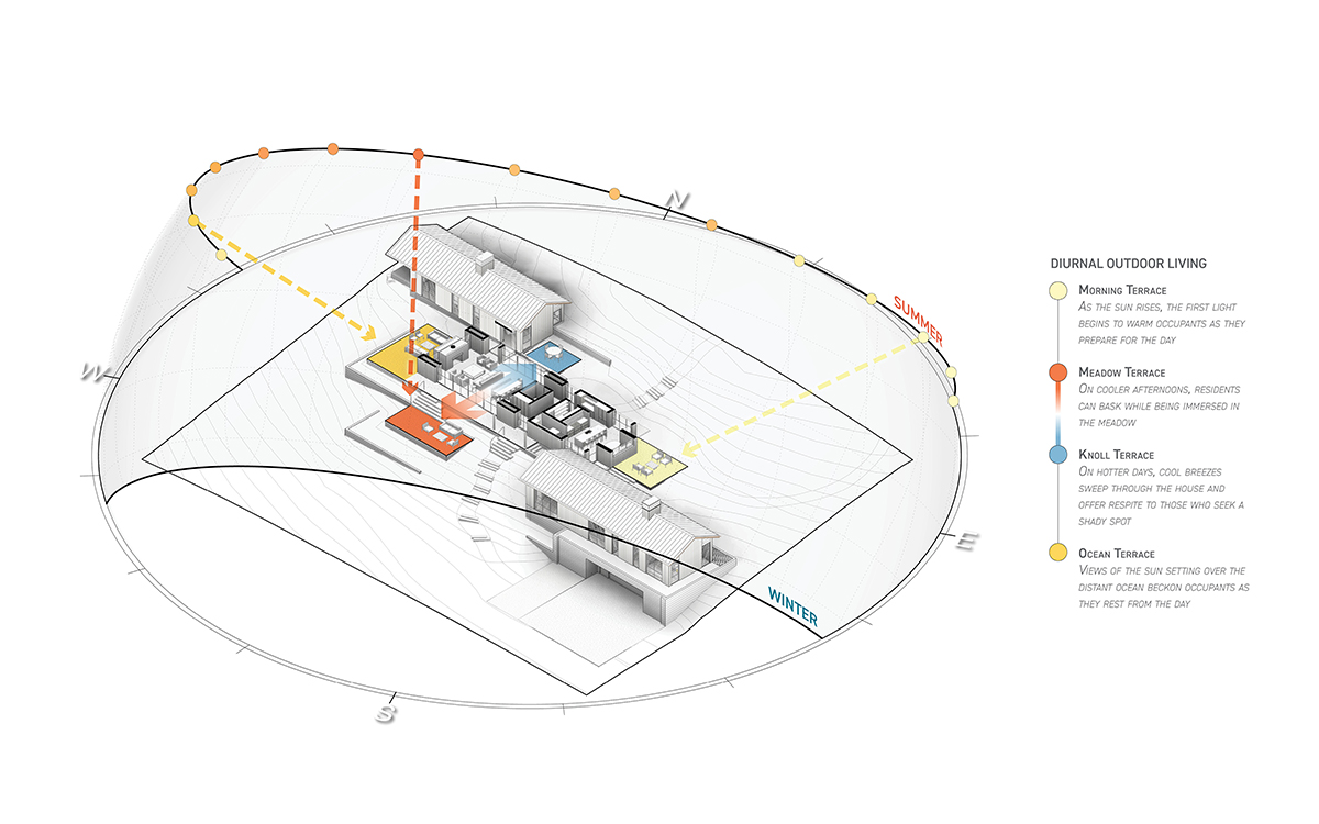The full-time home also needed to feel cozy for two, while accommodating visiting children and grandchildren. Pulling apart the plan into separate volumes trimmed the apparent size of the house while providing more views in those cardinal directions. The volumes open to a multitude of outdoor spaces that tap the best times of day for each. Says Brett, “The west faces a big sweep of Monterey Bay; the east faces the rising sun; the north is out of the wind; the south overlooks a pond.”