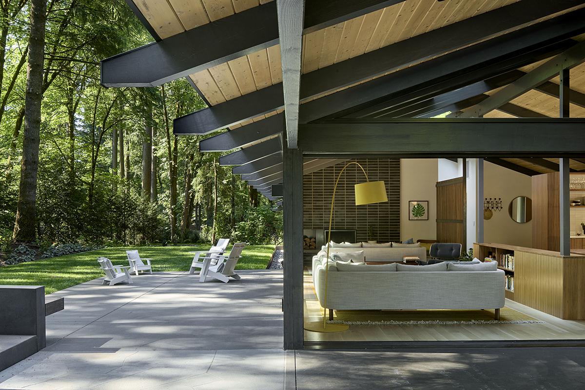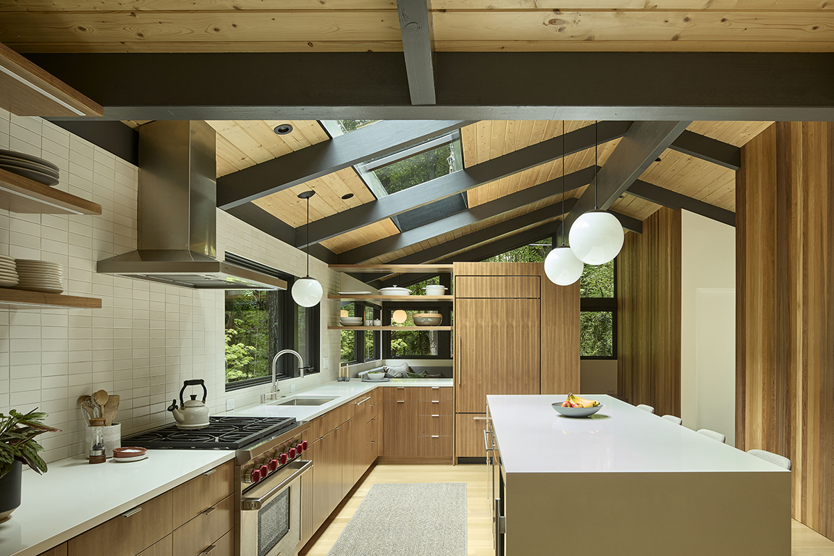 In addition to Frank Lloyd Wright, Risa points to the handcrafted quality, texture, and forms of Brazilian architect Oscar Niemeyer and Wright apprentice and renowned architect John Lautner as influential to her design aesthetic. Favorite materials include Cor-Ten steel for exteriors; black powder-coated steel for interiors; and concrete and smooth-troweled plaster for their minimalist look and malleability. Given their location in the Pacific Northwest, RSA projects often integrate wood structural elements, millwork, and finishes. Rough-hewn cedar siding and rift-sawn walnut and white oak, in particular, “lend themselves well to Midcentury design,” Risa says.