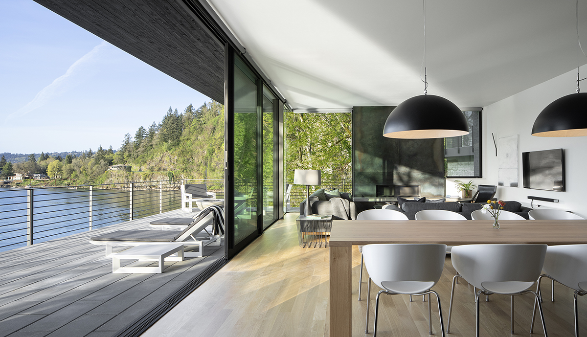 Riverwood, Risa’s first new construction project in Portland, is a 6,242-square-foot residence that hosts multiple family generations. The design’s strategic massing and setbacks enable views to the Willamette River from nearly every room. “The clients were fantastic and creative people who wanted a minimalist box,” Risa says. At night, the house’s black-painted exterior disappears into the darkness and shadows of the surrounding trees.